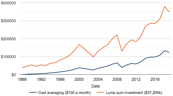 D’après les calculs de Schroders, l’investissement unique aurait aujourd’hui une valeur de 350 000 USD, ce qui équivaut à un rendement annuel de 7,5 %. Le même montant investi petit à petit au cours des 31 mêmes années aurait aujourd’hui une valeur de 123 395 USD, soit un rendement annuel de 3,9 %. Notez qu’aucun de ces chiffres n’a été ajusté pour tenir compte de l’inflation ou des coûts.