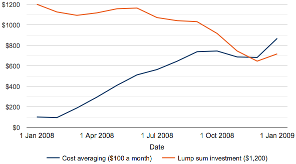 Les exemples illustrent l’ancien adage du marché qui dit que plus un investisseur est en mesure d’investir et plus tôt il investit, plus le rendement potentiel est élevé, à condition de pouvoir laisser à son investissement le temps de croître et d’embellir. Mais investir la totalité du montant en une fois représente un risque. Comment l’investisseur se serait-il senti s’il avait investi 37 200 USD en janvier 2008 et qu’il s’était retrouvé en décembre 2008 avec un capital d’à peine plus de 20 000 USD ? Sans doute assez mal.